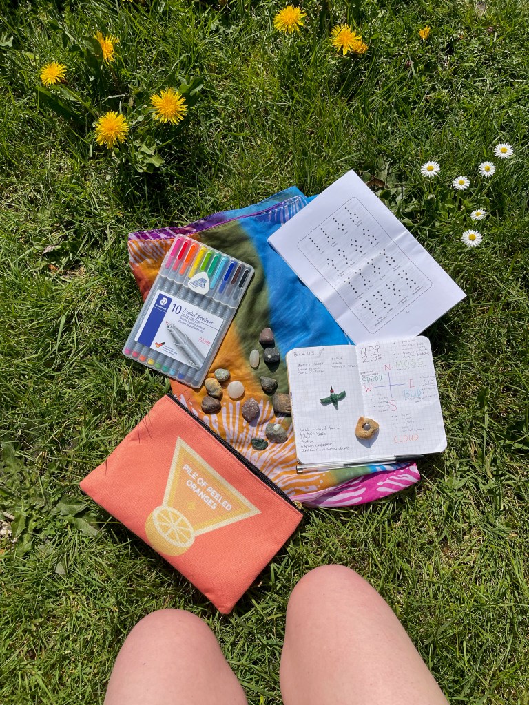 It occurred to me that, rather than sitting in one place and casting pinecones or rocks or anything else, I could find unique groupings of flora and fauna in the area to get my numbers. This gave me a little more in-depth site analysis, which was a lot of fun, and gave me an excuse to put Plants of the Pacific Northwest Coast to good use. I counted stems, groupings of rocks, holes in snags, and birdcall syllables, and per The Liminal Spirit Oracle, recording a single mark for odd numbers, and two for even.